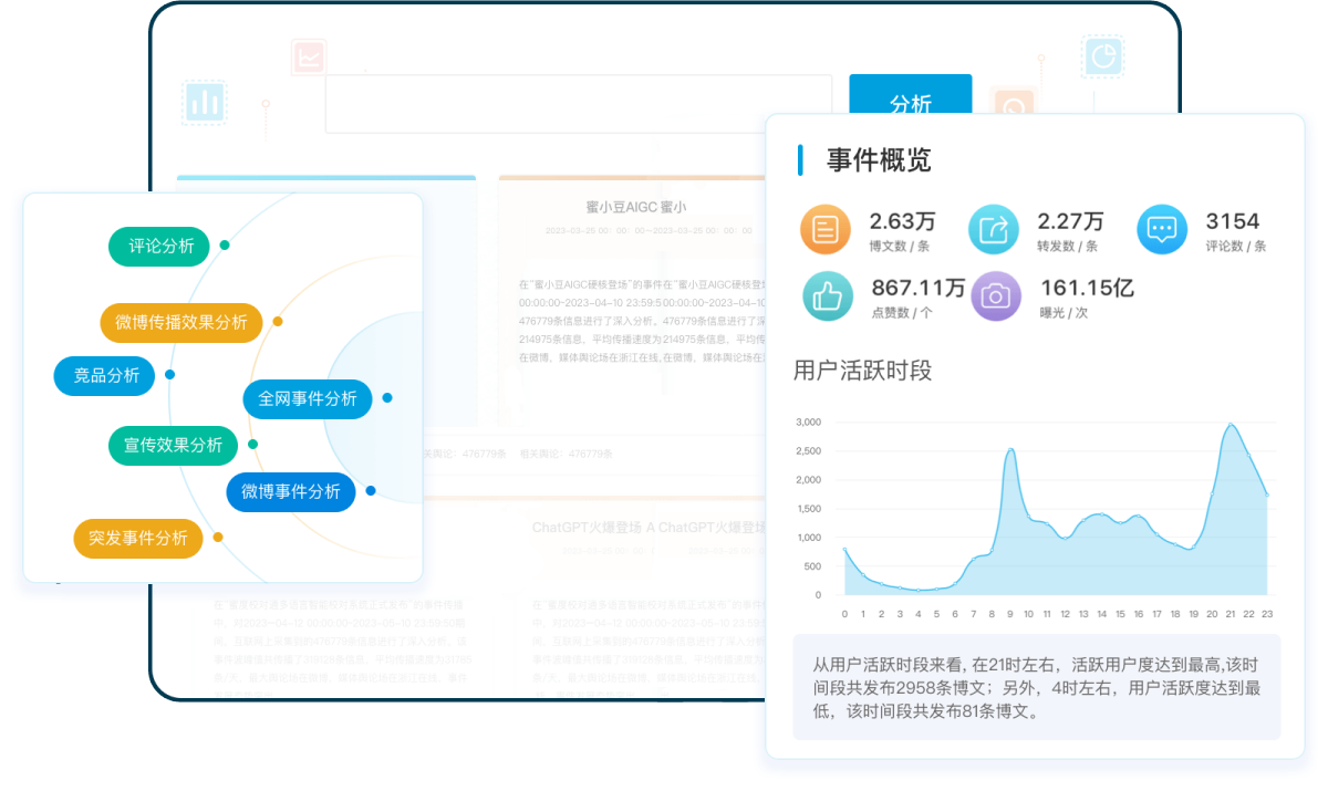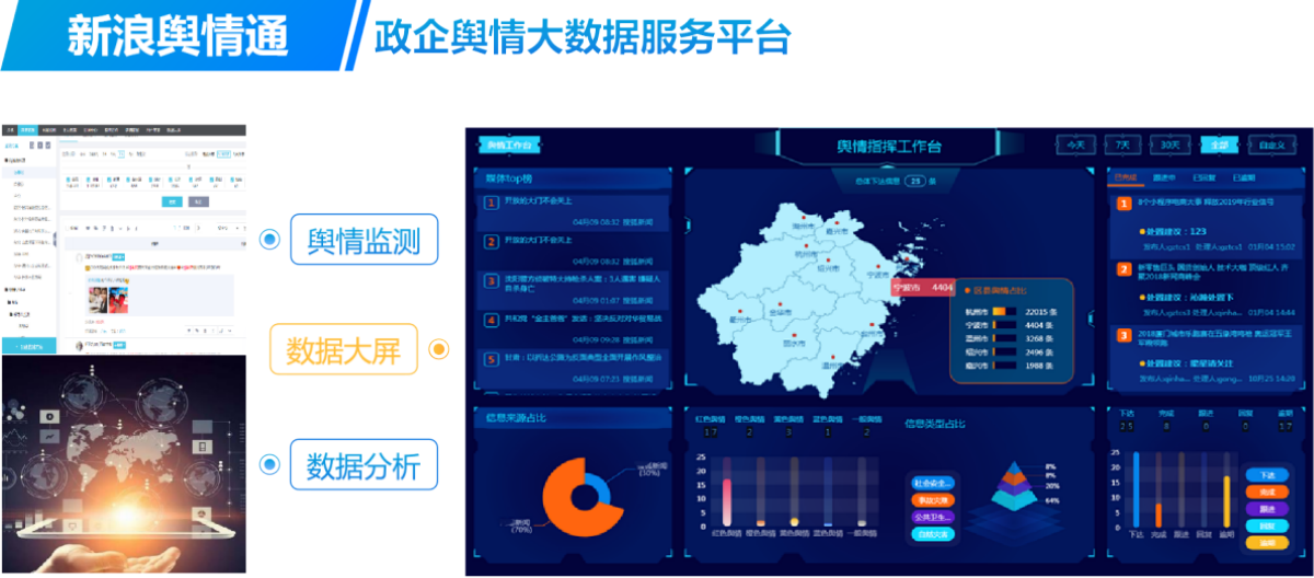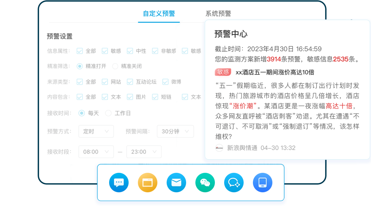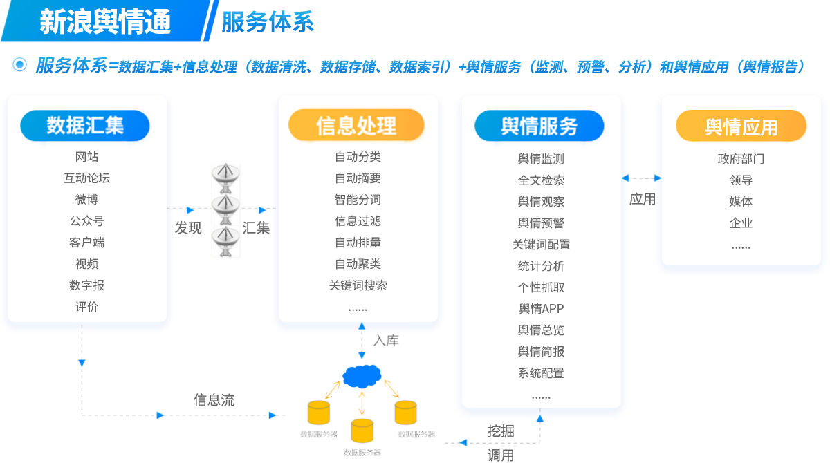 新浪舆情通是一款基于互联网信息聚合、文本挖掘和智能检索等技术的数据智能软件。用于发现互联网中的舆情信息,并对信息进行自动分类、智能过滤、自动聚类、主题检测和统计分析,实现对热点话题、突发事件的智能识别和定向追踪,帮助政府、媒体和企事业单位及时掌握网络传播动向,为有效应对网络舆情事件提供决策依据。