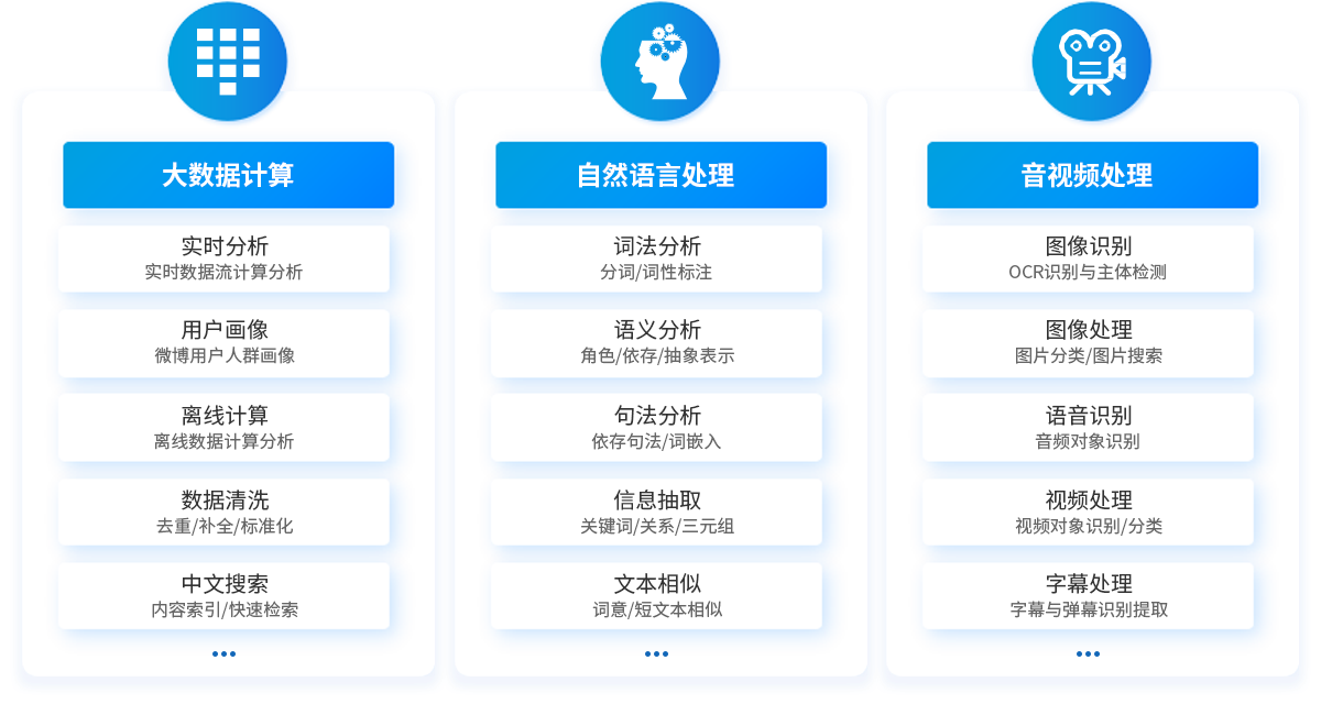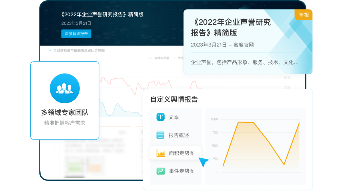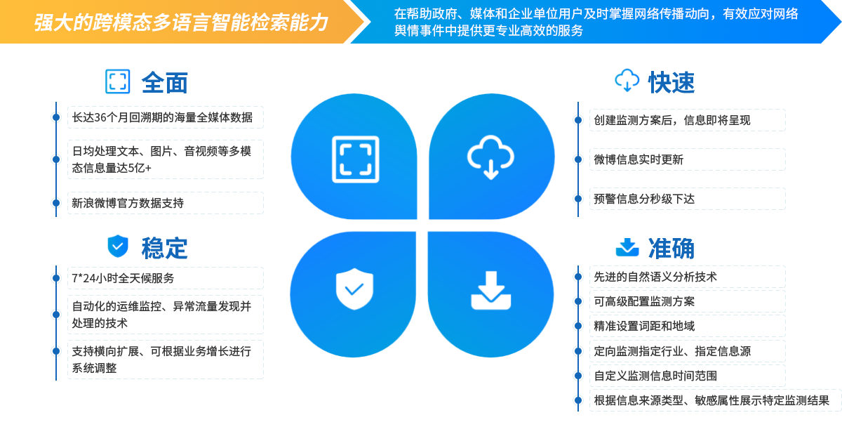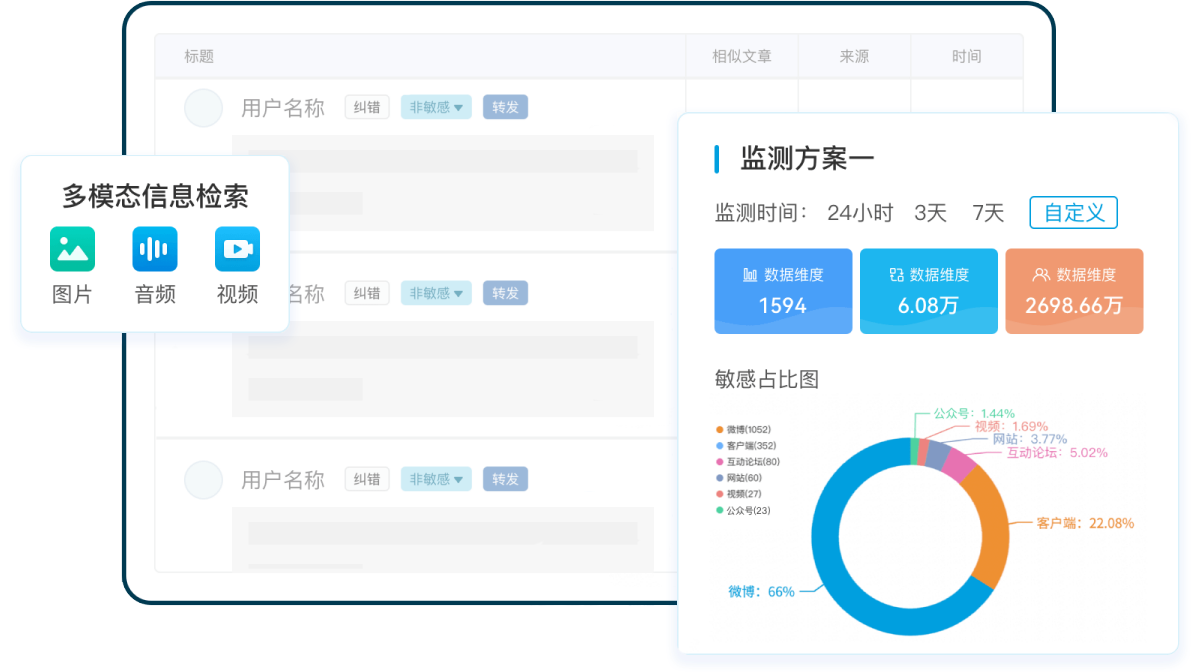 深耕舆情监测行业十余年,海量全媒体多模态数据覆盖网站、微博、公众号、短视频等全媒体上的文本、图片及音视频等信息,通过强大的信息处理能力,实现从数据融合到智能应用的全流程服务。